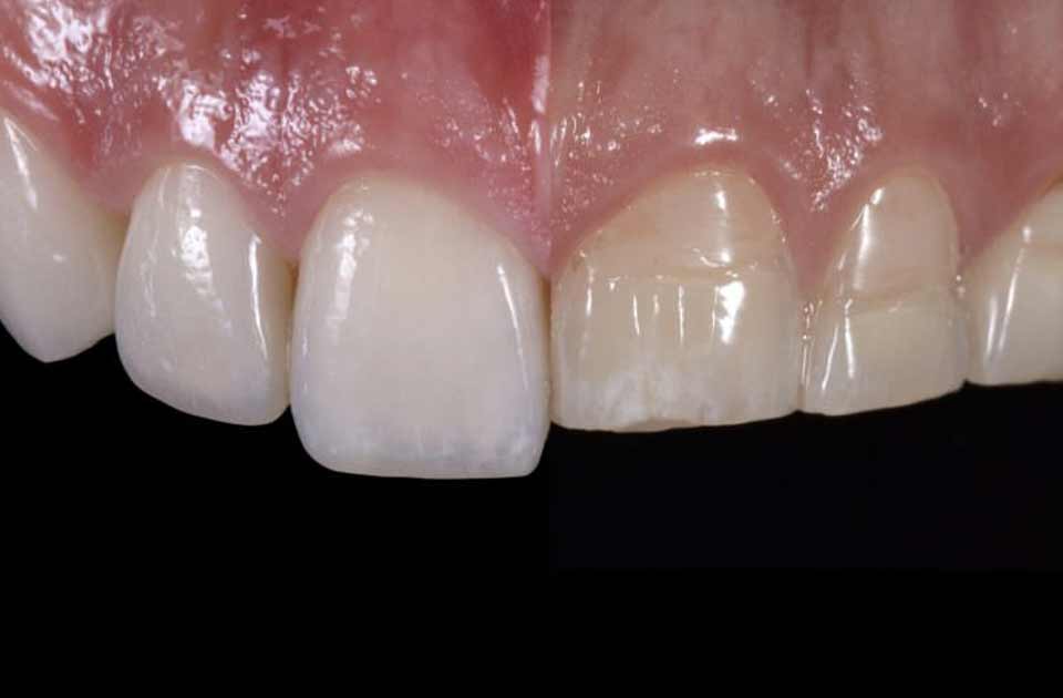 دندان هایی که به دلیل رنگ تیره تر بودن بافت زرد به نظر می رسند از طریق رقیق کردن مینای دندان نشان داده می شوند